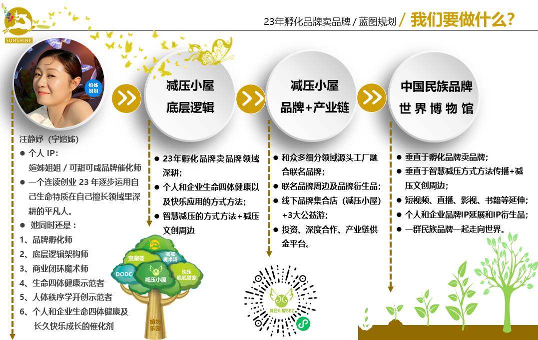 汪静妤:可甜可咸品牌催化师 个人IP媗姊姐姐,企业IP媗姊乐园 一个连续24年逐步运用自己生命特质在自己擅长领域里深耕的平凡人 她同时还是: 1,品牌孵化师; 2,底层逻辑架构师; 3,商业闭环魔术师; 4,生命四体健康示范者; 5,人体秩序学开创示范者; 6,个人和企业生命四体健康及长久快乐成长的催化剂