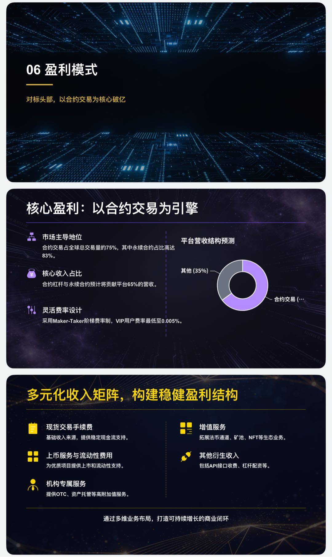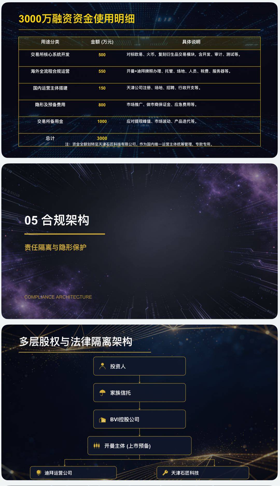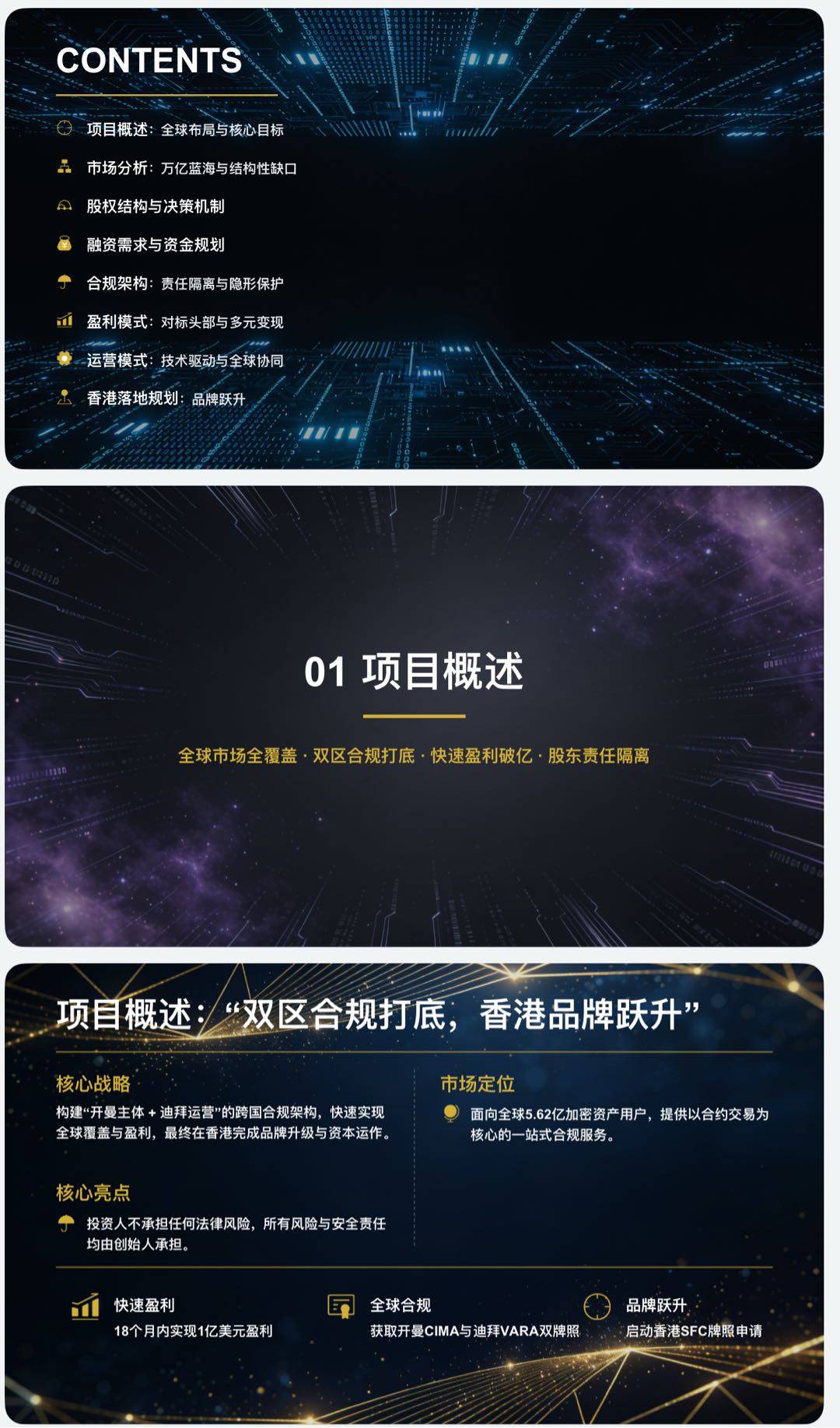 1. 合规架构清晰、技术安全可控、盈利潜力强劲的全球高杠杆加密衍生品交易所,采用开曼控股+马耳他/迪拜持牌运营+境内技术隔离模式,配备BitGo海外全托管,预计年营收1.5亿-3亿美元。 2. 聚焦全球专业交易员的合规高杠杆加密衍生品交易所,主打200倍自定义杠杆与0.01%超低滑点,搭配海外全托管与三重安全保障,年营收目标1.5亿-3亿美元。 3. 由资深加密交易所团队打造的合规型全球高杠杆衍生品交易平台,依托海外持牌架构、全托管资金安全机制,预计年营收可达1.5亿-3亿美元。 需要我帮你把这句话适配成不同场景的短文案,比如朋友圈推广、投资人私信、社群分享吗?